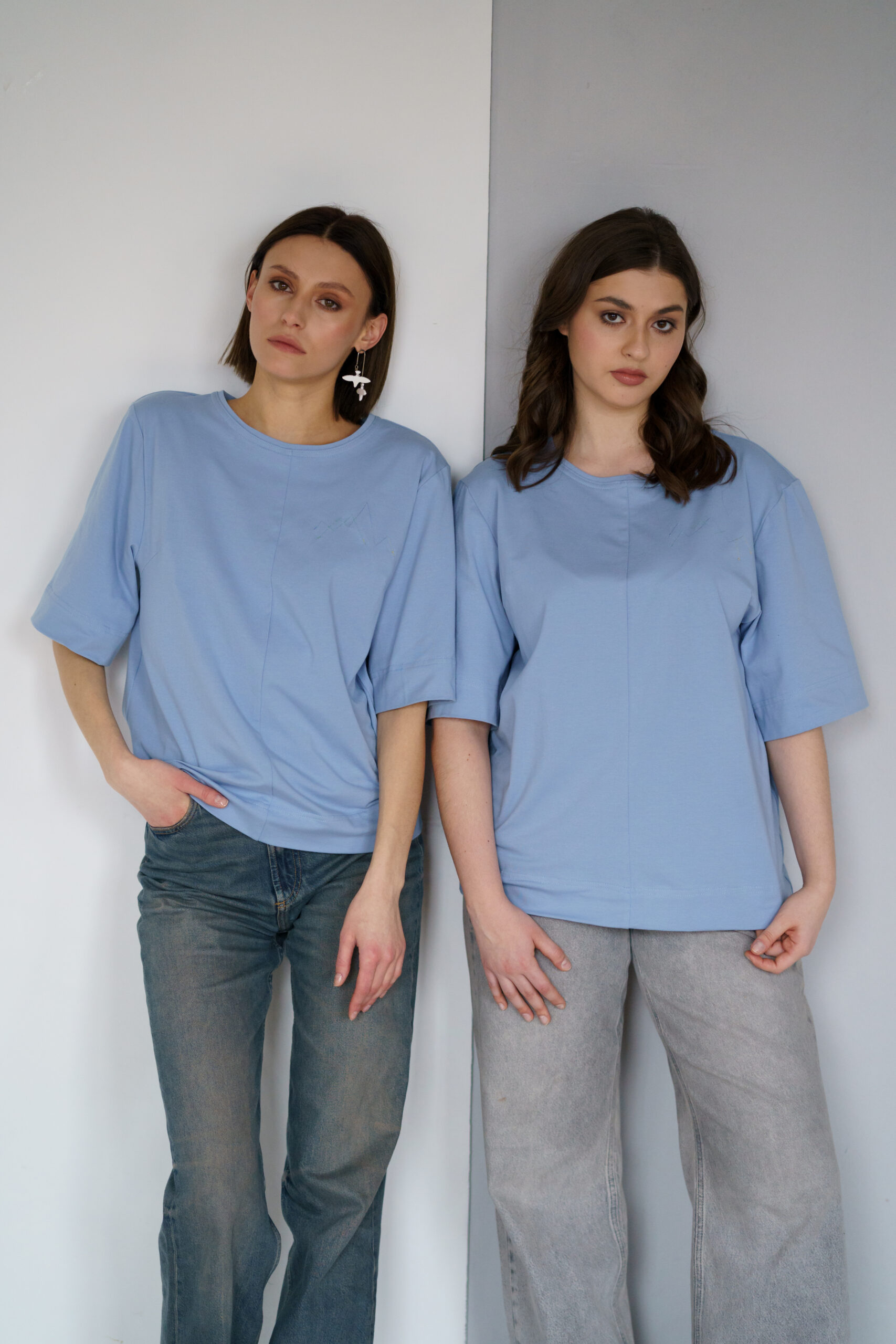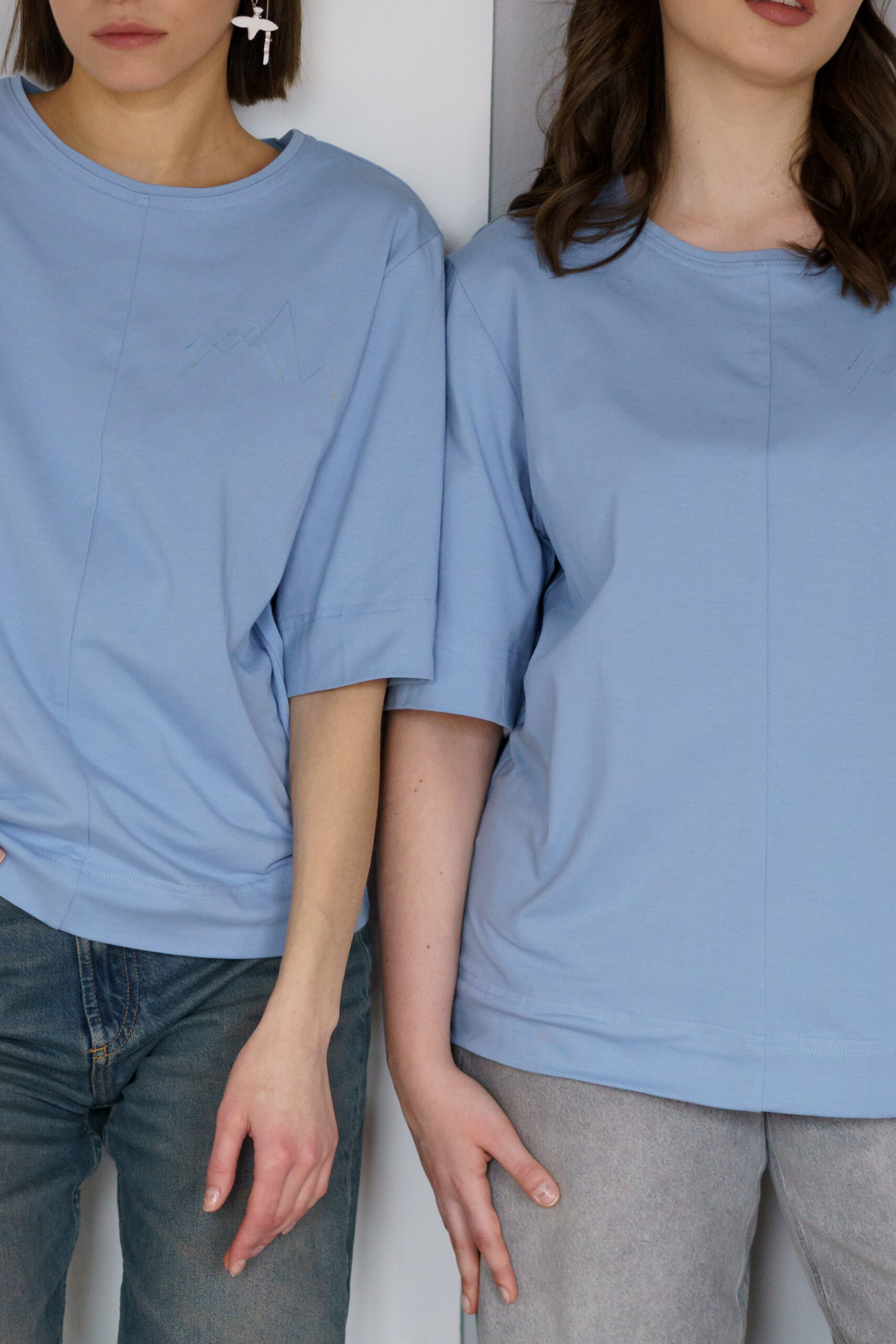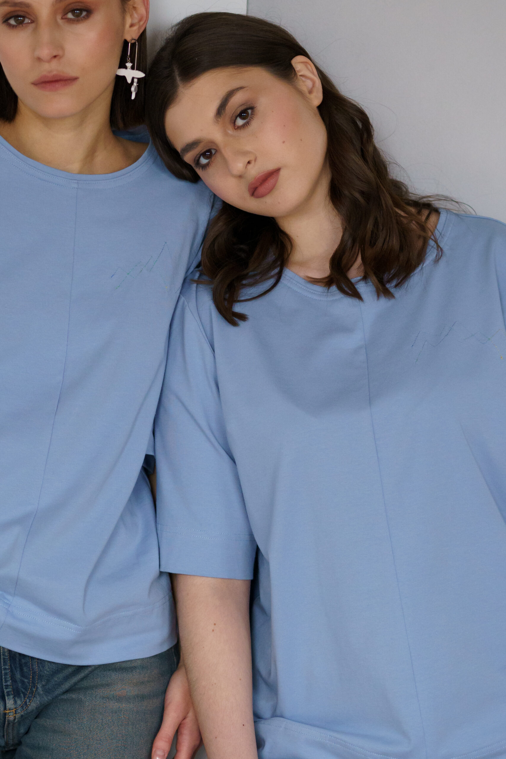 Авторський крій футболки створено командою бренду для жінок. Наші футболки мають підкреслену лінію грудей завдяки нагрудній виточці та швам по центру спини і переду та делікатну вишивку гір біля серця: “Гори в моєму серденьку”
