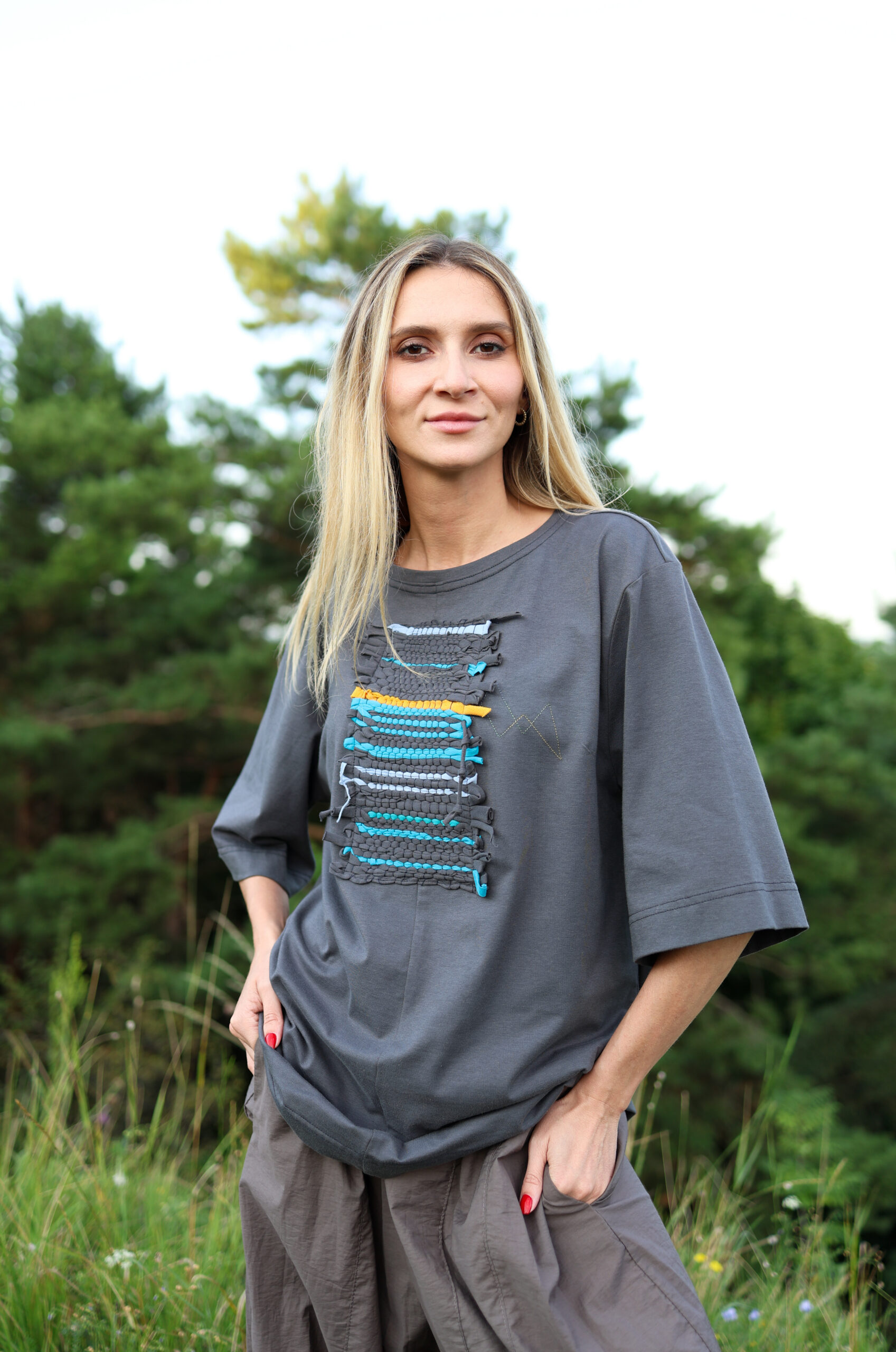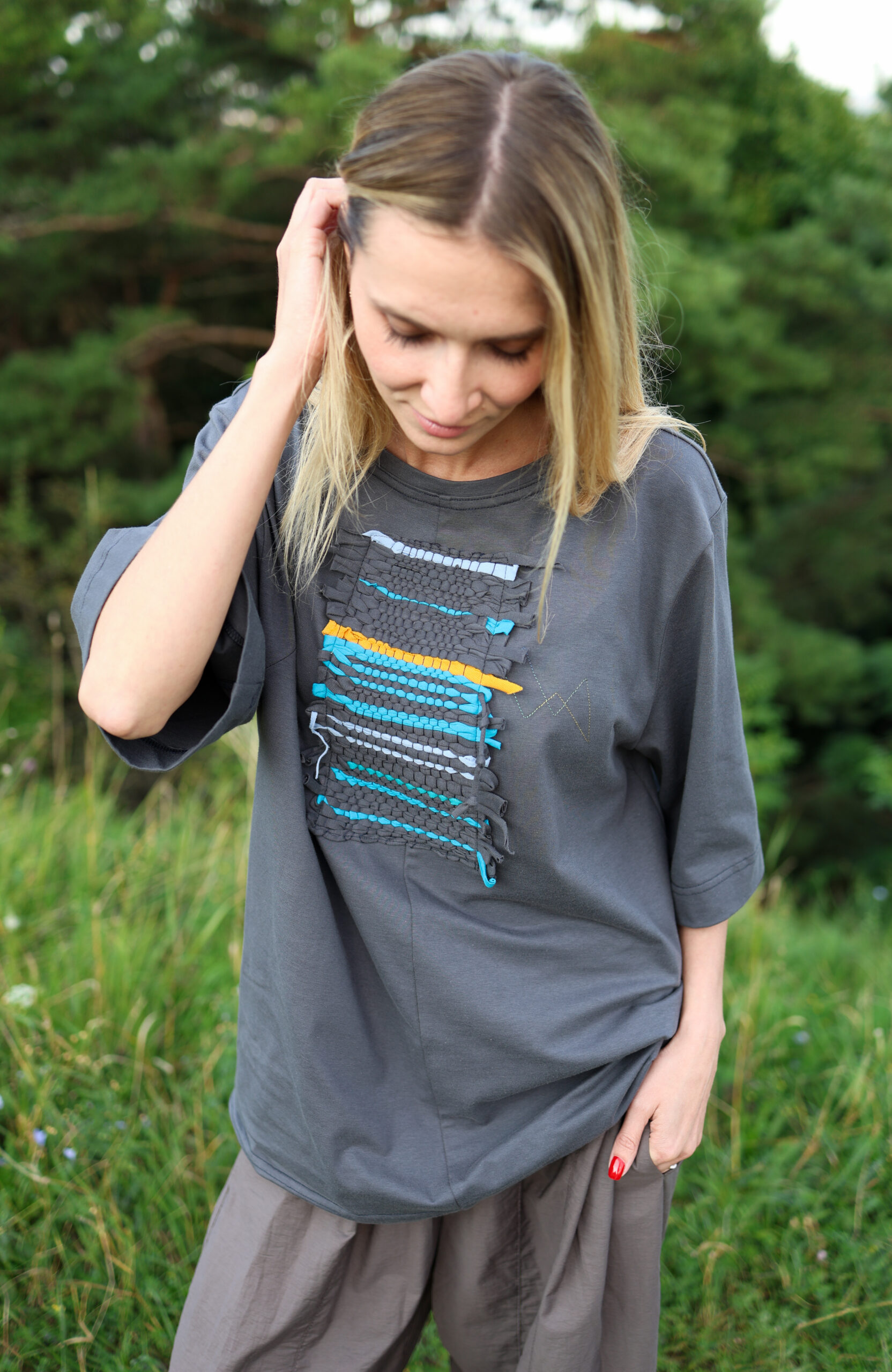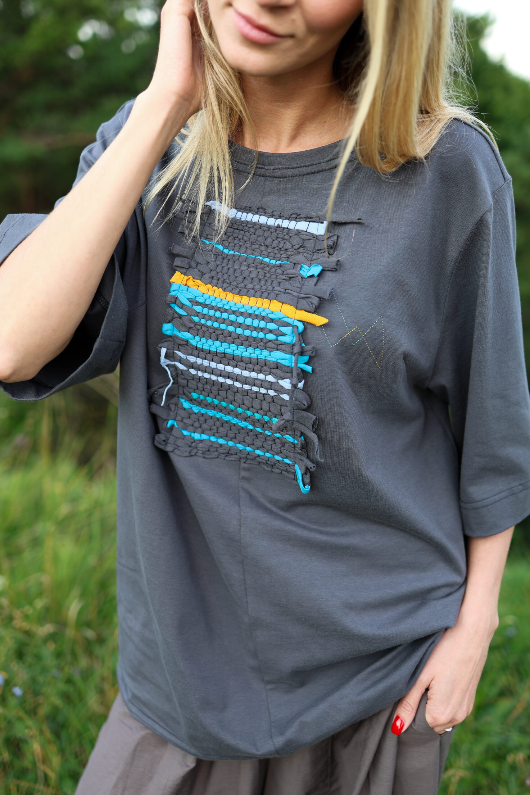 Футболки з тканням виготовлені з органічної бавовни без синтетичних домішків, саме тому в нас обмежена кольорова гама основи: молочні, блакитні, сірі та темно сині футболки. Ткання виготовлено на рамці з трикотажних шматків, які ми зберігаємо після шиття футболок. Для ткання використовуємо такі кольори трикотажу: