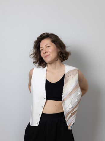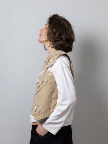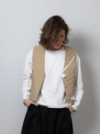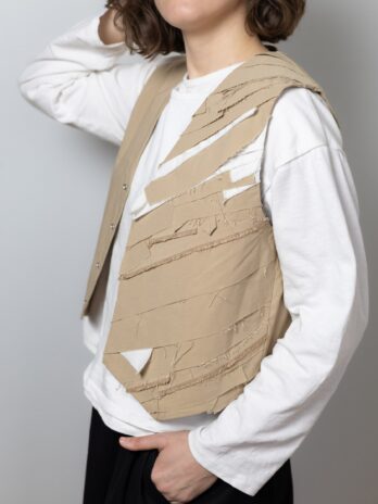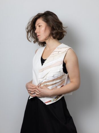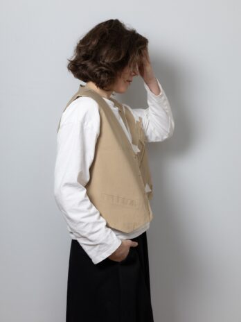 Виготовлена з щільної, еластичної, костюмної тканини, яка добре тримає форму, замість підкладу використовуємо тканину верху, завдяки цьому методу обробки всі жилетки є двосторонніми, кнопка також двостороння.