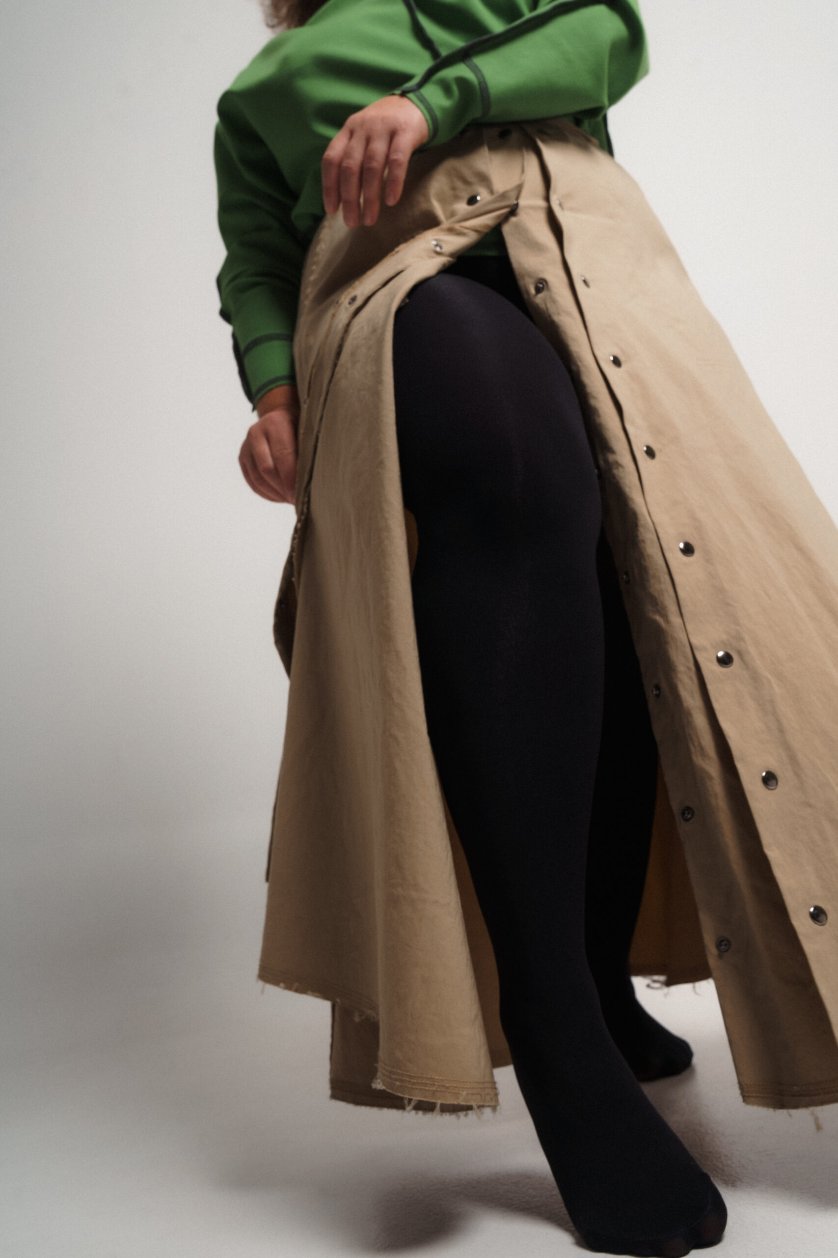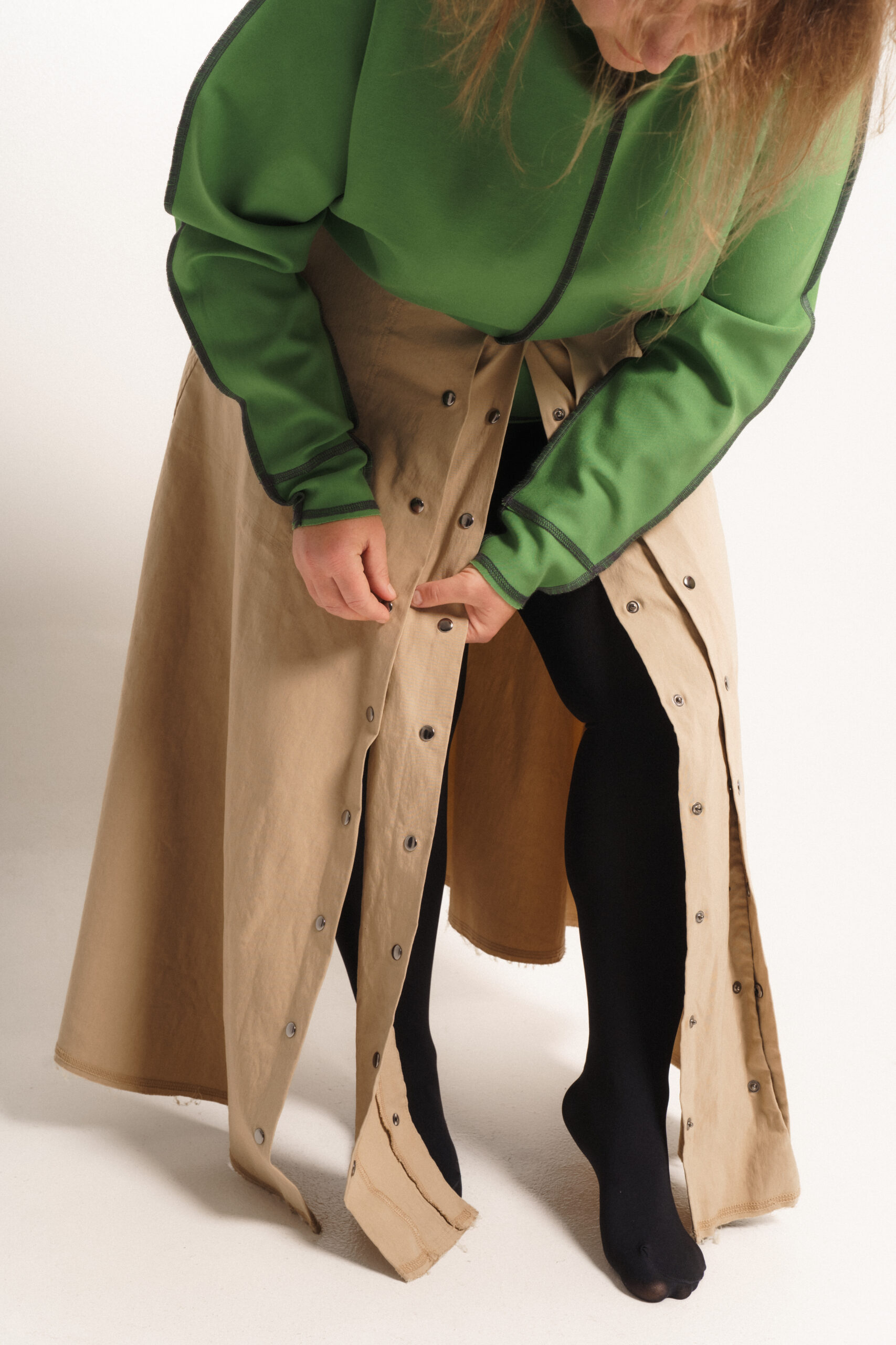 Спідниця А-силуету з трьома рядами функціональних кнопок, якими можна створювати розпірку бажаної довжини, має бокові кишені. Тканина щільна, фактурна бавовна з великим вмістом еластану не продувається вітром, а також комфортна в спеку.