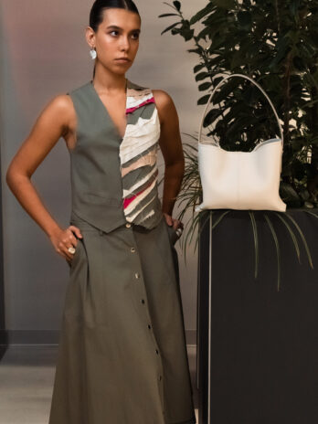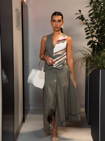 З бежевим жилетками утворює костюм. Талія регулюється додатковою копкою.