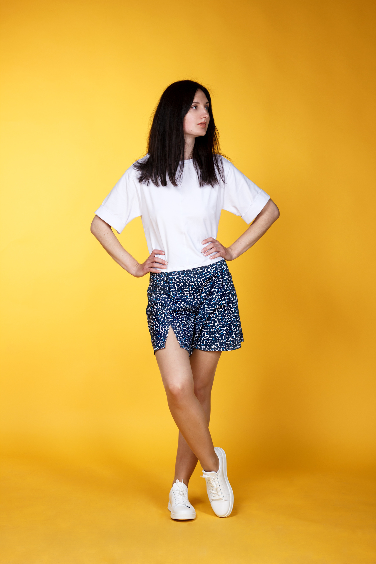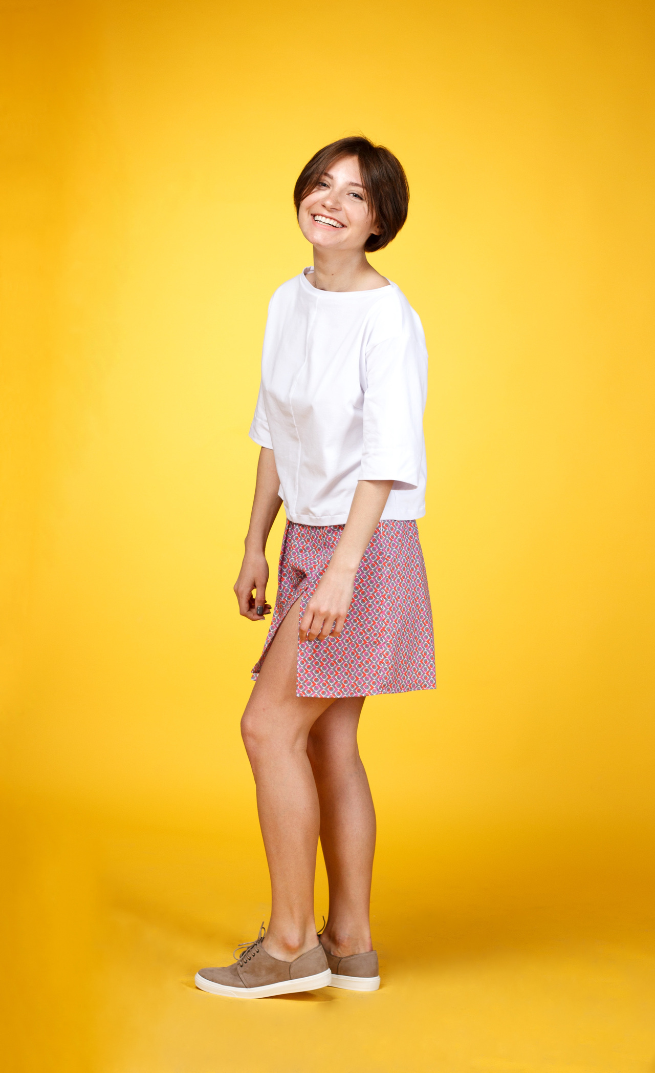 Футболка з швами по центру виробу та виточками. Подовжений рукав, який загортається в манжет. Широка лінія підгину низу.