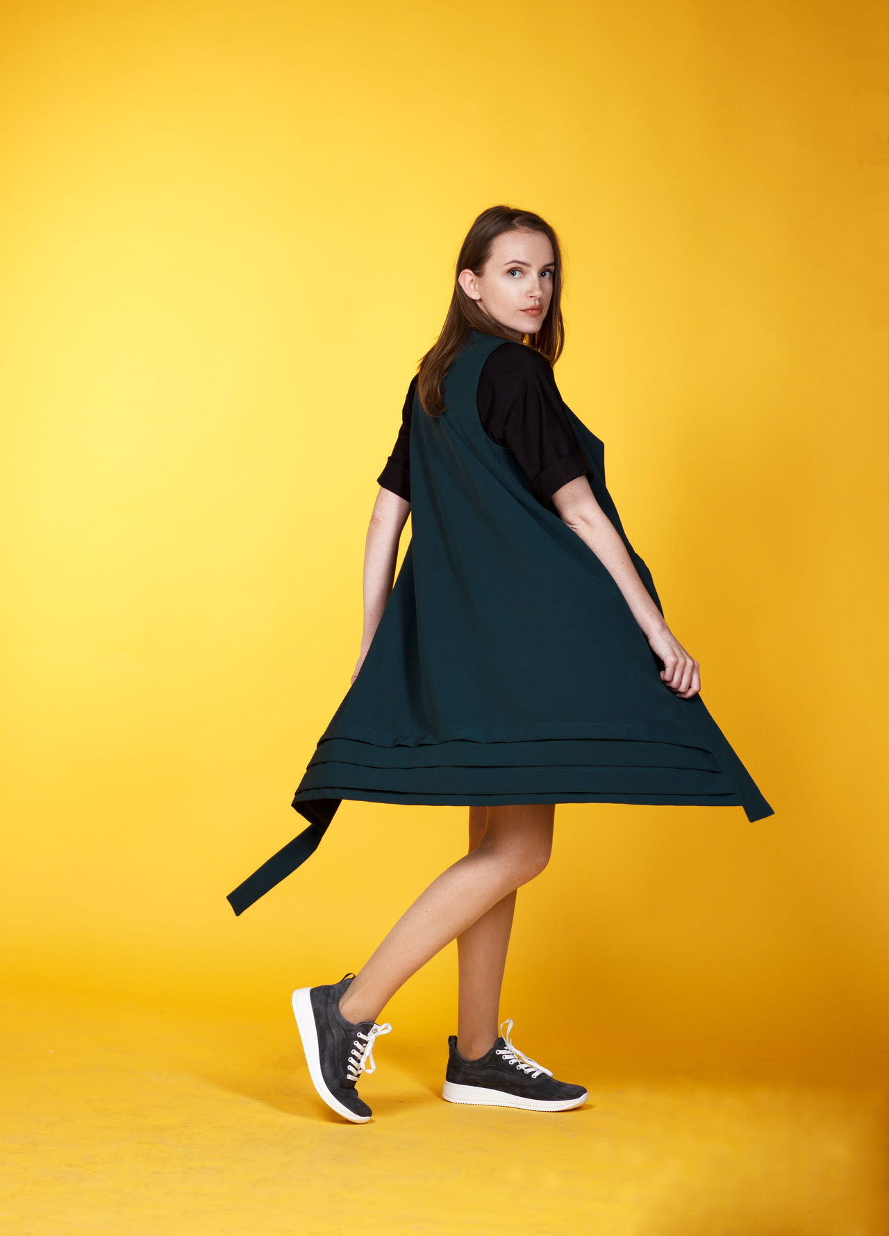 Футболка з швами по центру виробу та виточками. Подовжений рукав, який загортається в манжет. Широка лінія підгину низу. Довжина виробу 50 см. Тканина: 95% бавовна 5% еластан